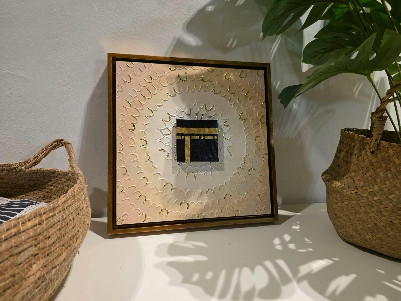 At the center, a meticulously sculpted Kaaba emerges in deep black, accentuated with hand-applied golden detailing symbolizing purity, strength, and timeless reverence. Surrounding it, textured concentric patterns radiate outward like waves of light, crafted with sculptural mediums, layered pigments, and delicate touches of shimmer that catch the light from every angle. This technique gives the piece a dimensional presence, making it feel alive and spiritual in any setting.
